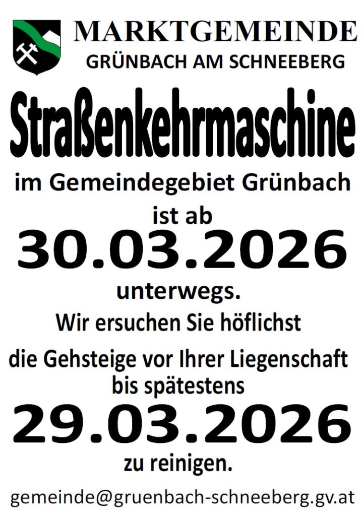 Wir ersuchen Sie höflichst, die Gehsteige vor Ihrer Liegenschaft bis spätestens 29.03.2026 zu reinigen, damit unsere Gemeinde wieder ein gepflegtes Ortsbild bietet. Bitte helfen Sie mit und unterstützen Sie dadurch unsere Gemeindearbeiter.